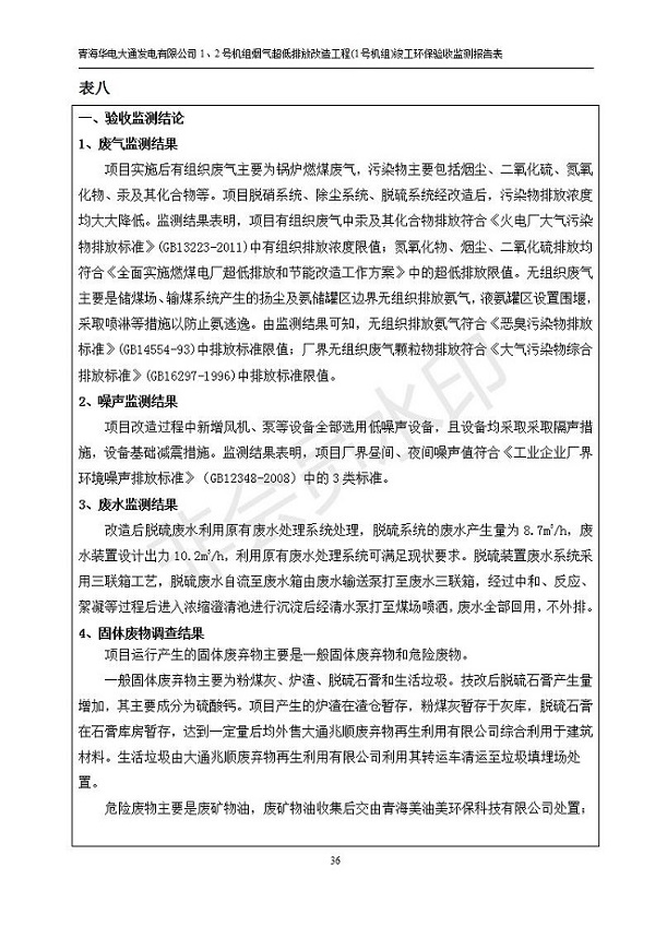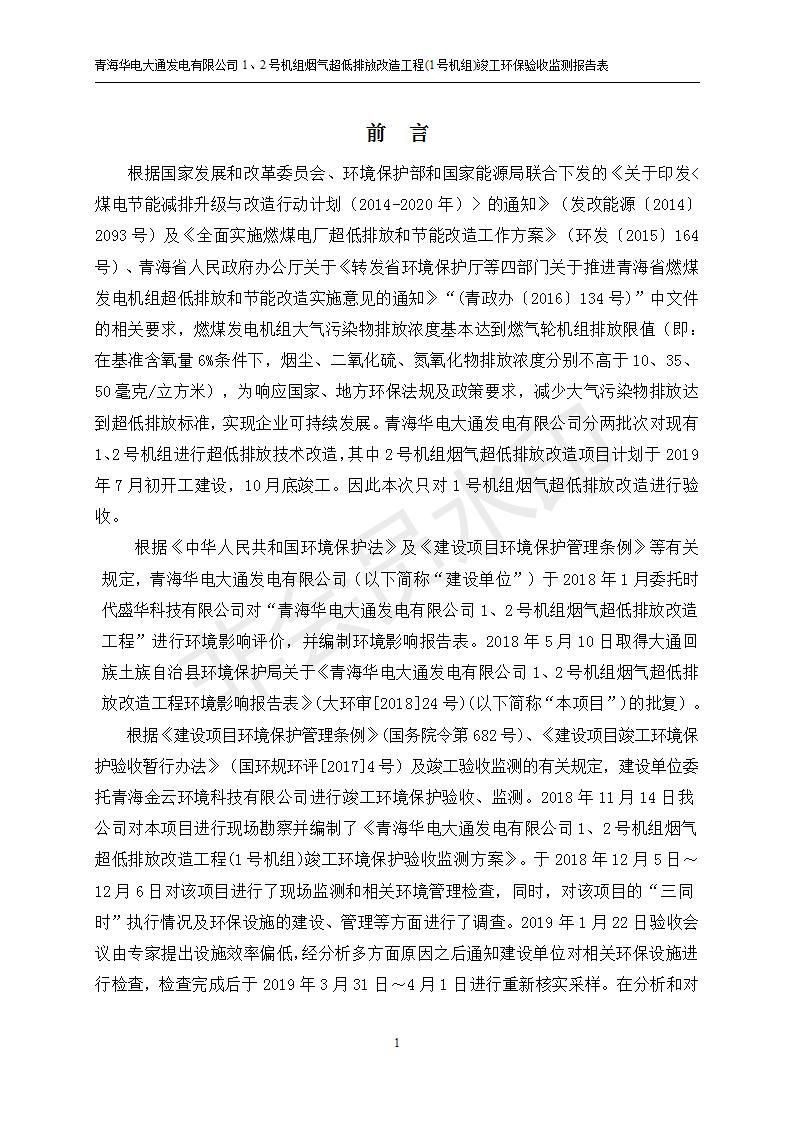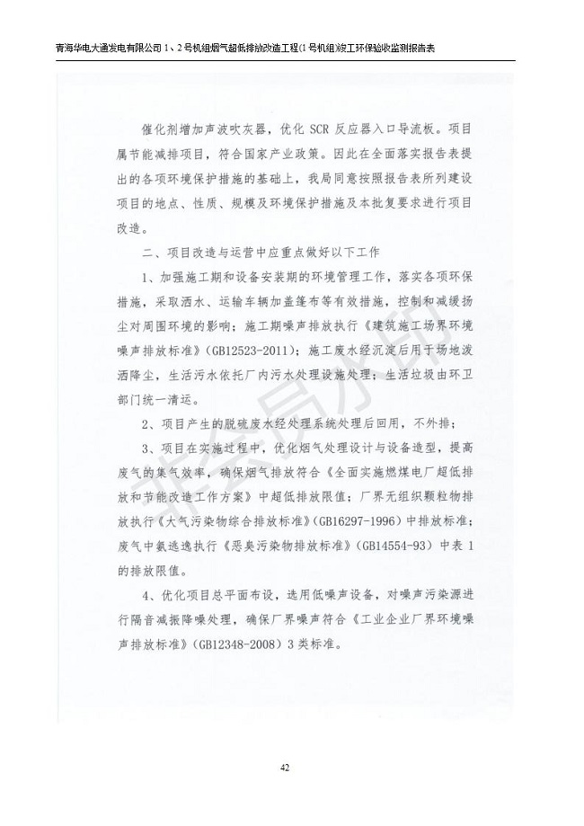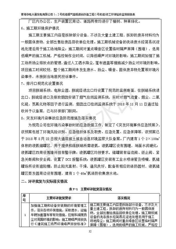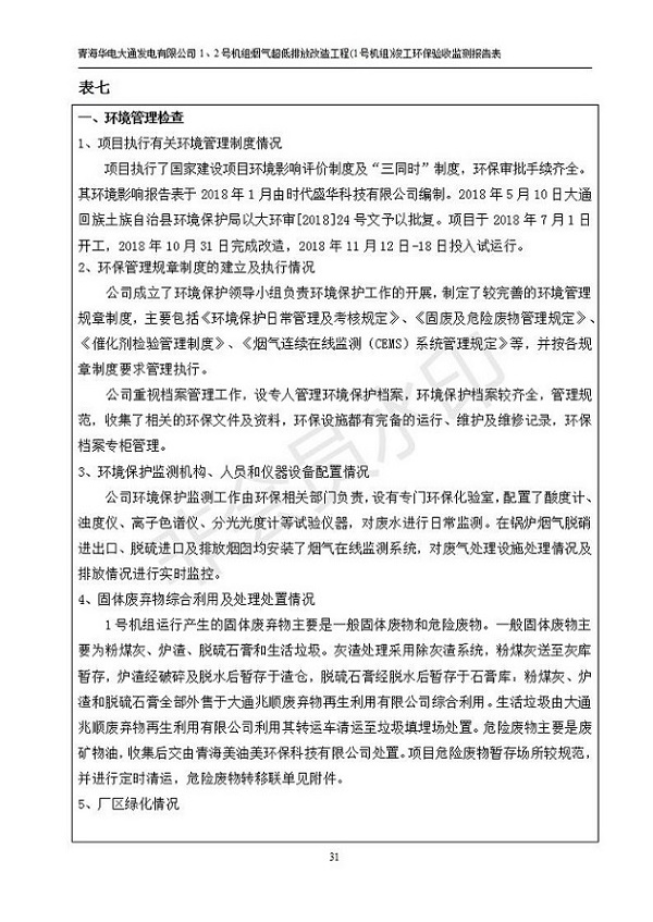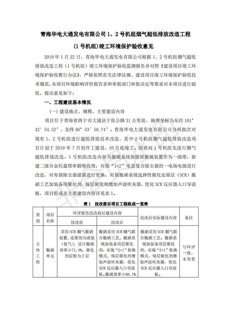 根據(jù)中華人民共和國(guó)國(guó)務(wù)院令第682號(hào)《國(guó)務(wù)院關(guān)于修改〈建設(shè)項(xiàng)目環(huán)境保護(hù)管理?xiàng)l例〉的決定》和《建設(shè)項(xiàng)目竣工環(huán)境保護(hù)驗(yàn)收暫行辦法》(國(guó)務(wù)院令682號(hào)),青海華電大通發(fā)電有限公司1、2號(hào)機(jī)組煙氣超低排放改造工程(1號(hào)機(jī)組) (包括竣工環(huán)境保護(hù)驗(yàn)收監(jiān)測(cè)報(bào)告表和驗(yàn)收意見(jiàn))公示如下。 一、項(xiàng)目名稱:青海華電大通發(fā)電有限公司1、2號(hào)機(jī)組煙氣超低排放改造工程(1號(hào)機(jī)組) 竣工環(huán)境保護(hù)驗(yàn)收監(jiān)測(cè)報(bào)告表 二、地點(diǎn):青海省西寧市大通縣寧張公路31公里處 三、建設(shè)單位:青海華電大通發(fā)電有限公司 四、建設(shè)內(nèi)容:1號(hào)機(jī)組煙氣超低排放改造,1號(hào)機(jī)組改造內(nèi)容為脫硫系統(tǒng)保留原脫硫裝置作為一級(jí)塔,新建二級(jí)合金托盤塔串聯(lián)吸收塔;對(duì)原“1+2”電袋復(fù)合除塵器的一電場(chǎng)電源進(jìn)行改造,對(duì)布袋除塵器濾袋進(jìn)行更換;對(duì)原脫硝系統(tǒng)選擇性催化還原法(SCR)脫硝工藝加裝備用催化劑,每層催化劑增加聲波吹灰器,優(yōu)化SCR反應(yīng)器入口導(dǎo)流板。 五、聯(lián)系人:張工 六、聯(lián)系電 話:0971-6515411 七、公示時(shí)間:二〇一九年二月十三日至二〇一九年三月十二日 公示期間,對(duì)上述公示內(nèi)容如有異議,請(qǐng)以書(shū)面形式反饋,個(gè)人須署真實(shí)姓名,單位須加蓋公章。