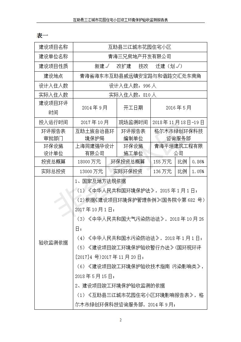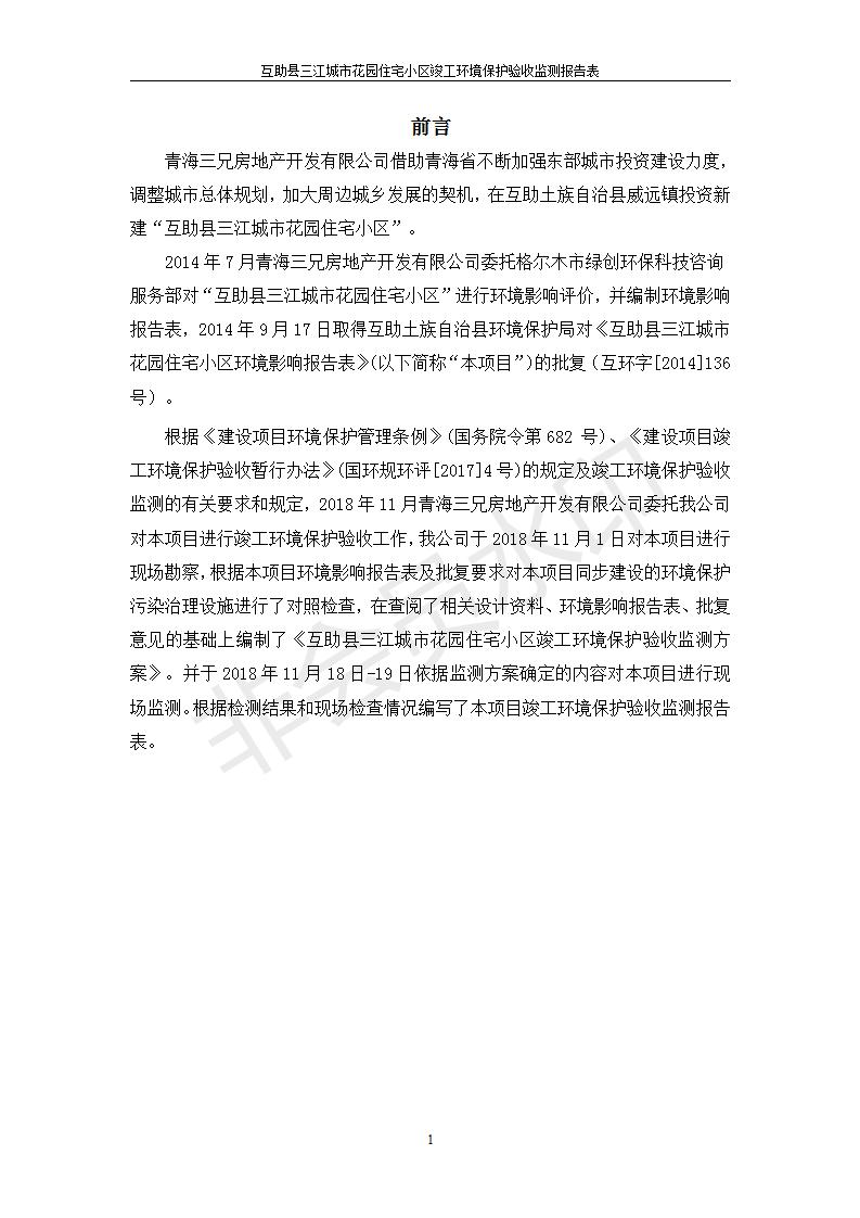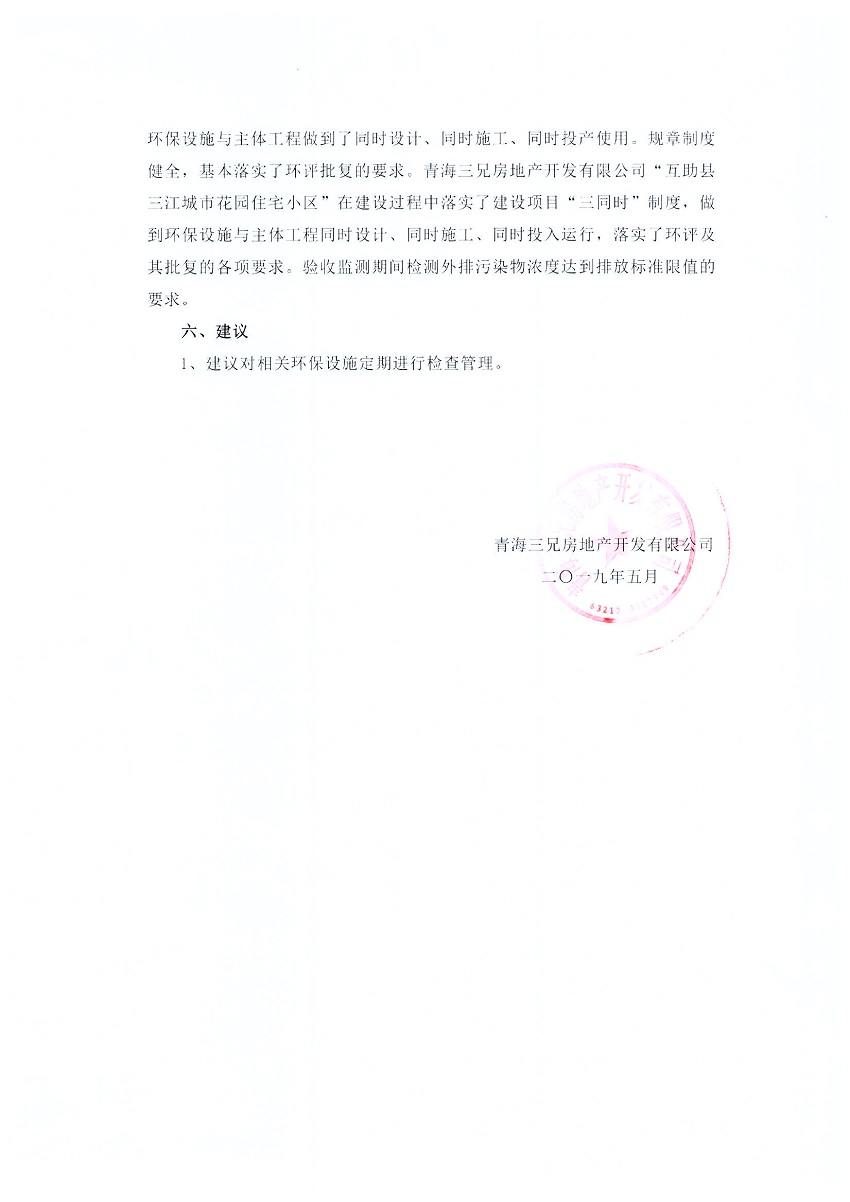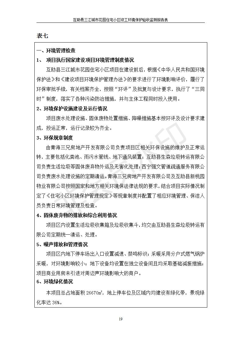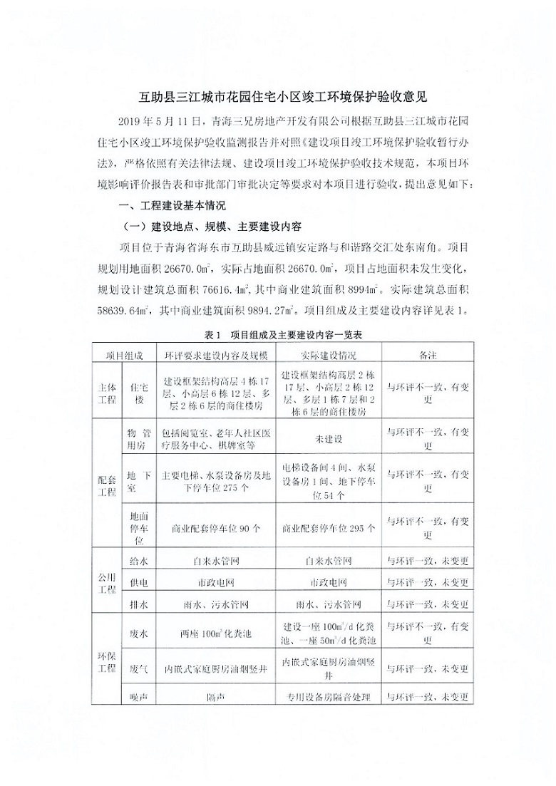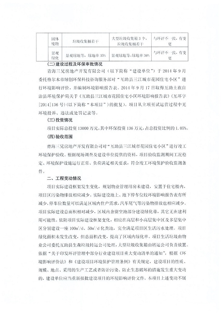 根據(jù)中華人民共和國國務院令第682號《國務院關(guān)于修改〈建設項目環(huán)境保護管理條例〉的決定》和《建設項目竣工環(huán)境保護驗收暫行辦法》(國務院令682號),互助縣三江城市花園住宅小區(qū)(包括竣工環(huán)境保護驗收監(jiān)測報告表和驗收意見)公示如下。 一、項目名稱: 互助縣三江城市花園住宅小區(qū)竣工環(huán)境保護驗收監(jiān)測報告表 二、地點:青海省海東市互助土族自治縣威遠鎮(zhèn)安定路與和諧路交匯處東南角 三、建設單位:青海三兄房地產(chǎn)開發(fā)有限公司 四、建設內(nèi)容:項目規(guī)劃用地面積26670.0m2,實際占地面積26670.0m2,項目占地面積未發(fā)生變化,規(guī)劃設計建筑總面積76616.4m2,其中商業(yè)建筑面積8994m2。實際建筑總面積58639.64m2,其中商業(yè)建筑面積9894.27m2。 五、聯(lián)系人:張工 六、聯(lián)系電 話:0971-6515411 七、公示時間:二〇一九年六月五日至二〇一九年七月三日 公示期間,對上述公示內(nèi)容如有異議,請以書面形式反饋,個人須署真實姓名,單位須加蓋公章。