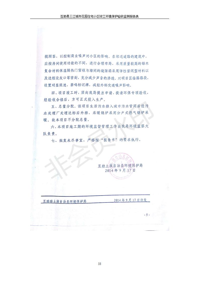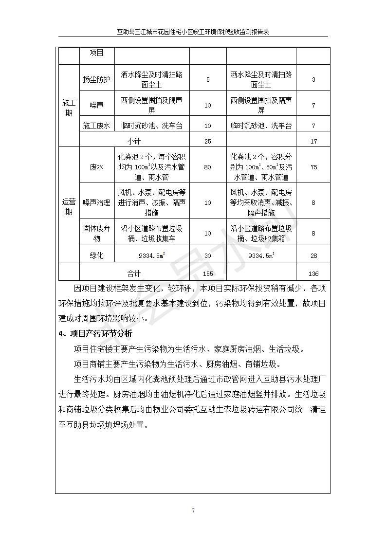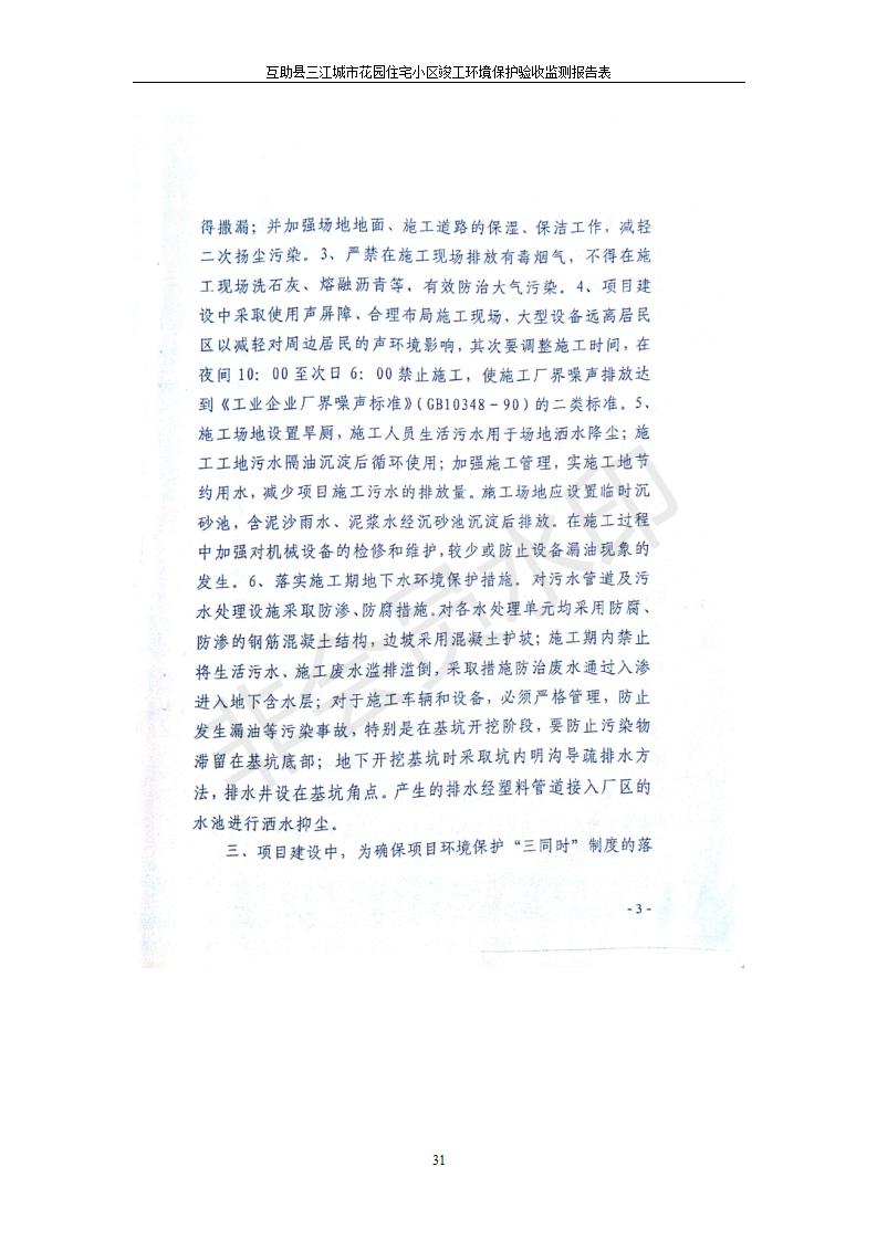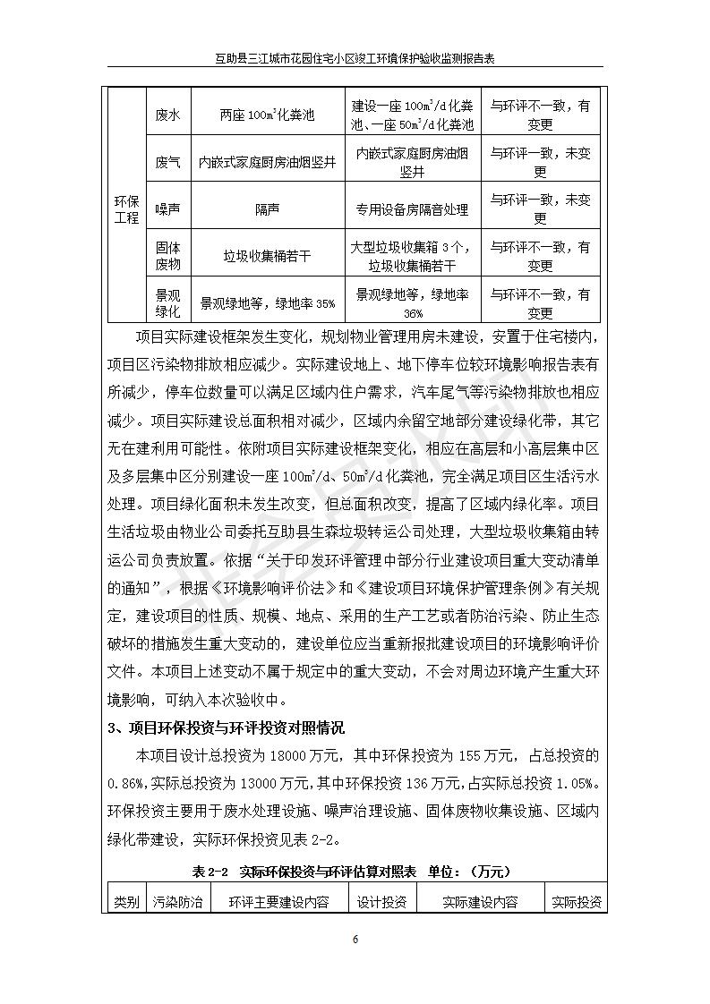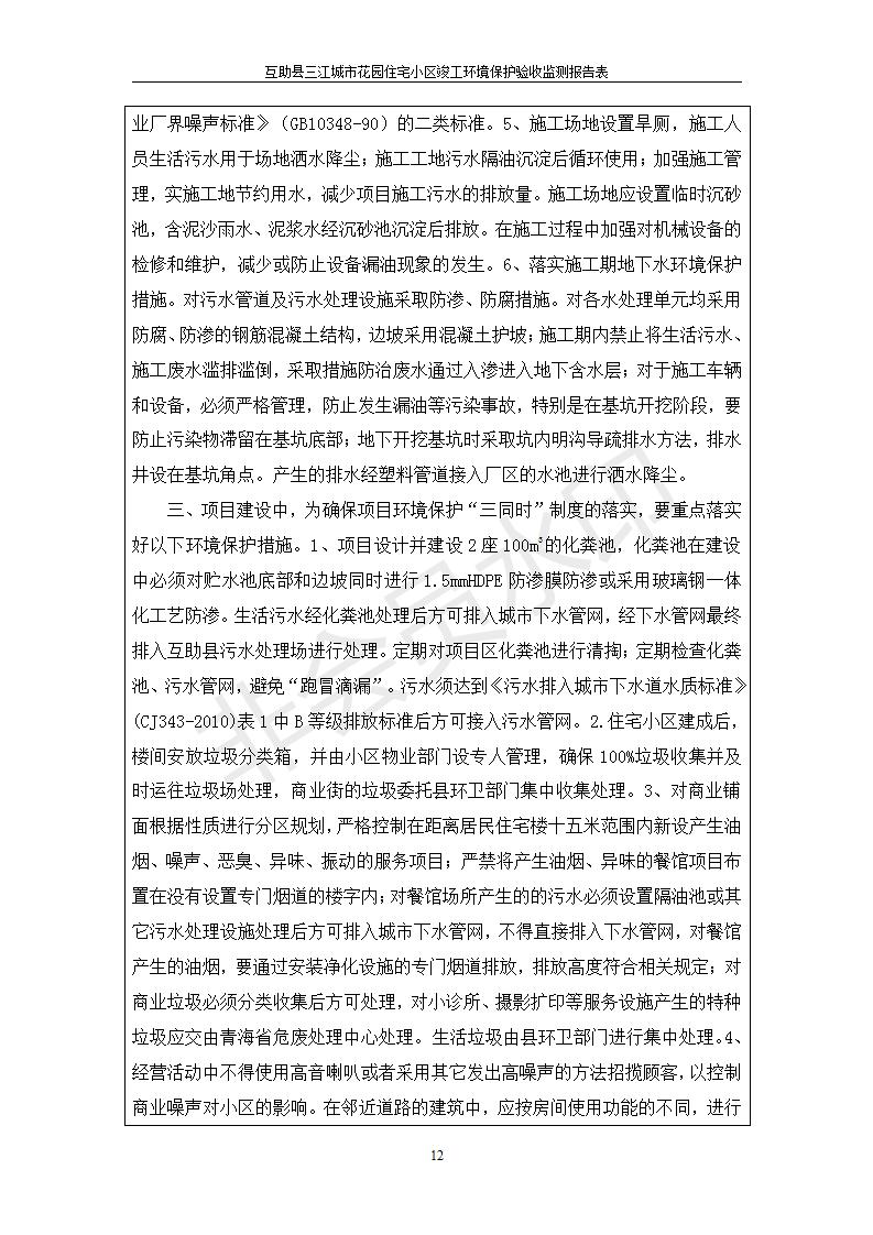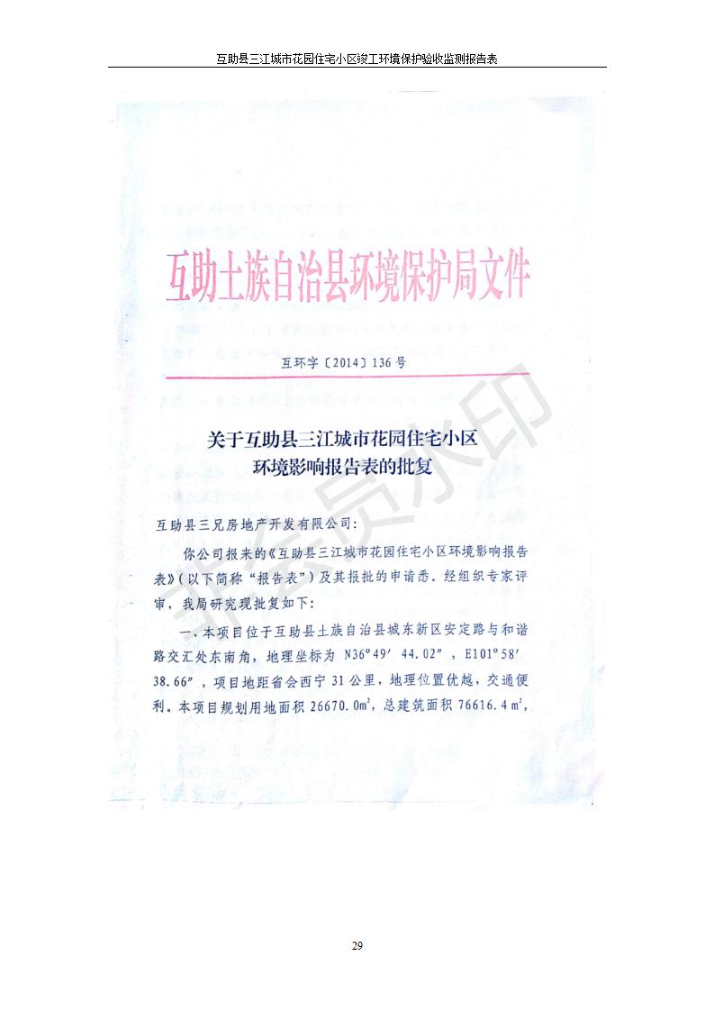 根據(jù)中華人民共和國國務院令第682號《國務院關(guān)于修改〈建設項目環(huán)境保護管理條例〉的決定》和《建設項目竣工環(huán)境保護驗收暫行辦法》(國務院令682號),互助縣三江城市花園住宅小區(qū)(包括竣工環(huán)境保護驗收監(jiān)測報告表和驗收意見)公示如下。 一、項目名稱: 互助縣三江城市花園住宅小區(qū)竣工環(huán)境保護驗收監(jiān)測報告表 二、地點:青海省海東市互助土族自治縣威遠鎮(zhèn)安定路與和諧路交匯處東南角 三、建設單位:青海三兄房地產(chǎn)開發(fā)有限公司 四、建設內(nèi)容:項目規(guī)劃用地面積26670.0m2,實際占地面積26670.0m2,項目占地面積未發(fā)生變化,規(guī)劃設計建筑總面積76616.4m2,其中商業(yè)建筑面積8994m2。實際建筑總面積58639.64m2,其中商業(yè)建筑面積9894.27m2。 五、聯(lián)系人:張工 六、聯(lián)系電 話:0971-6515411 七、公示時間:二〇一九年六月五日至二〇一九年七月三日 公示期間,對上述公示內(nèi)容如有異議,請以書面形式反饋,個人須署真實姓名,單位須加蓋公章。