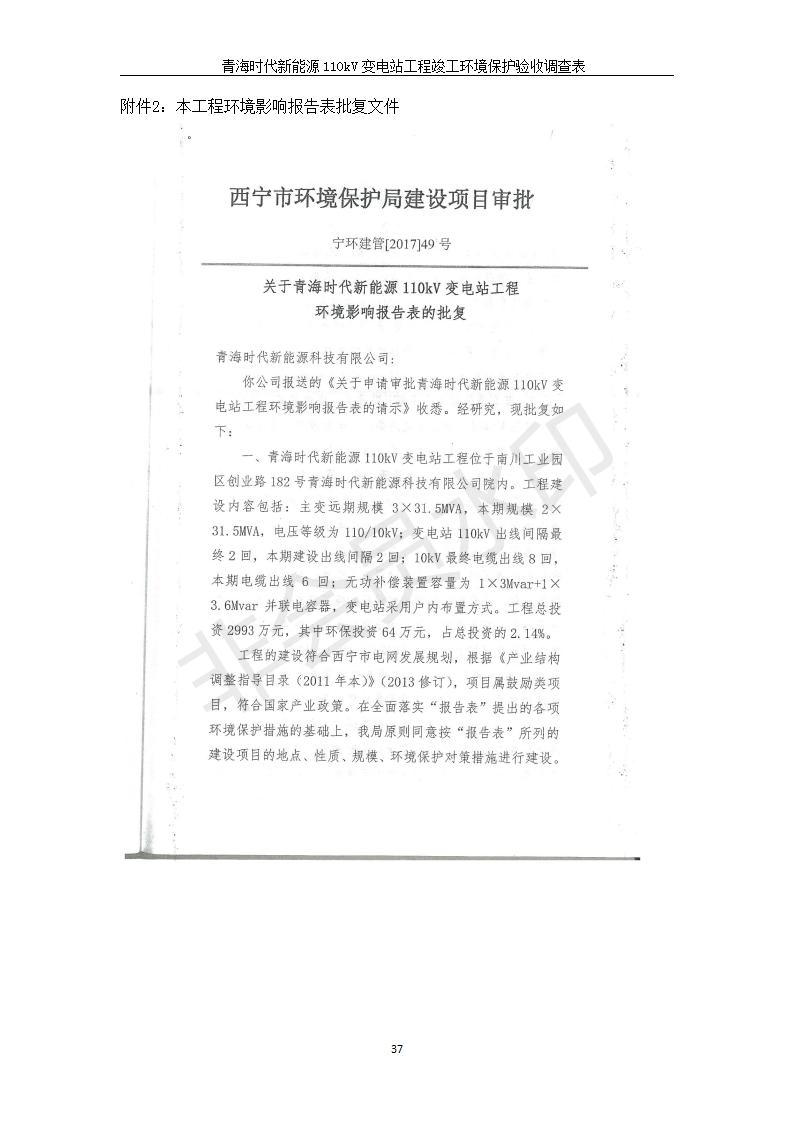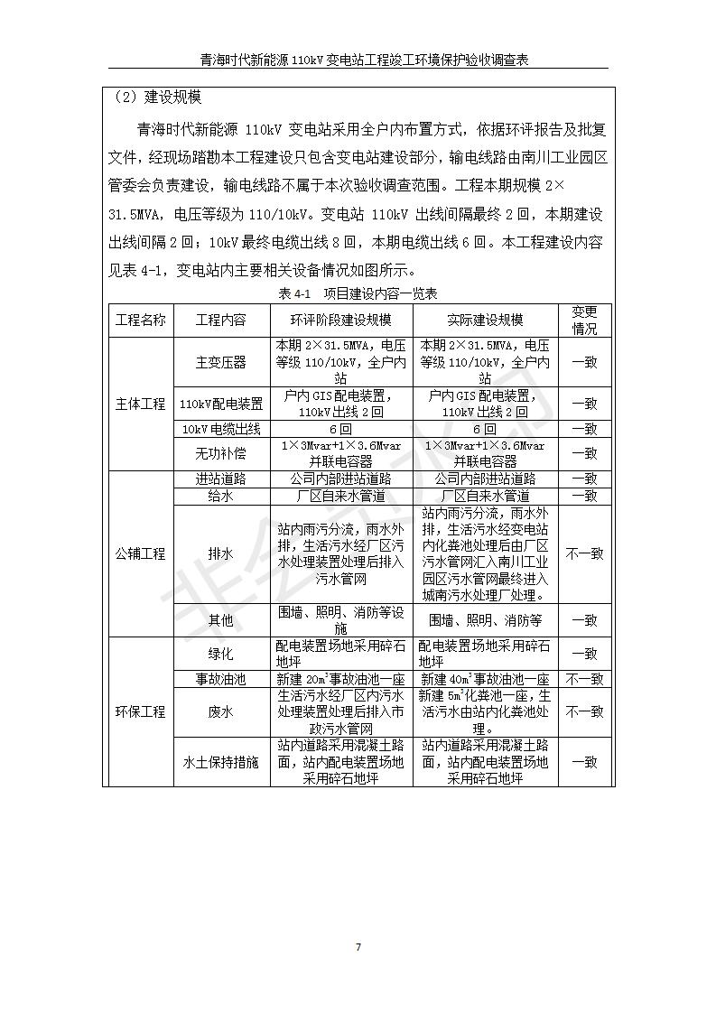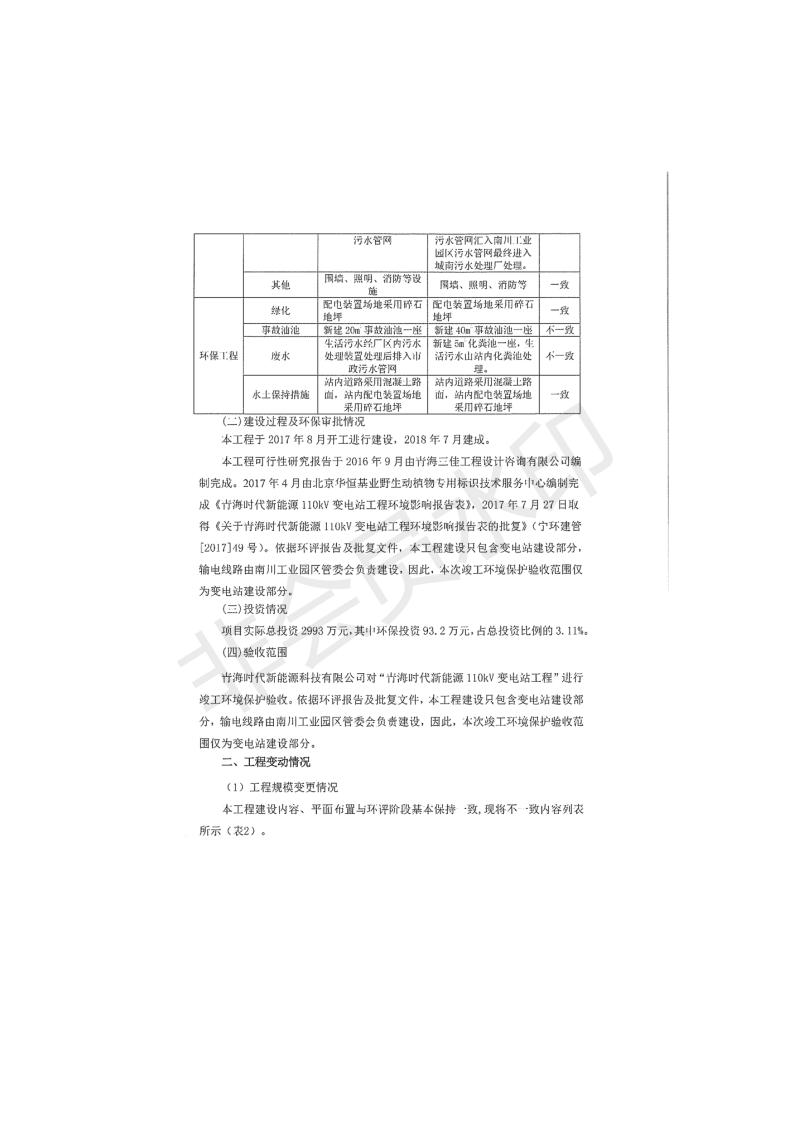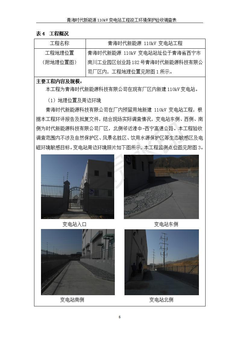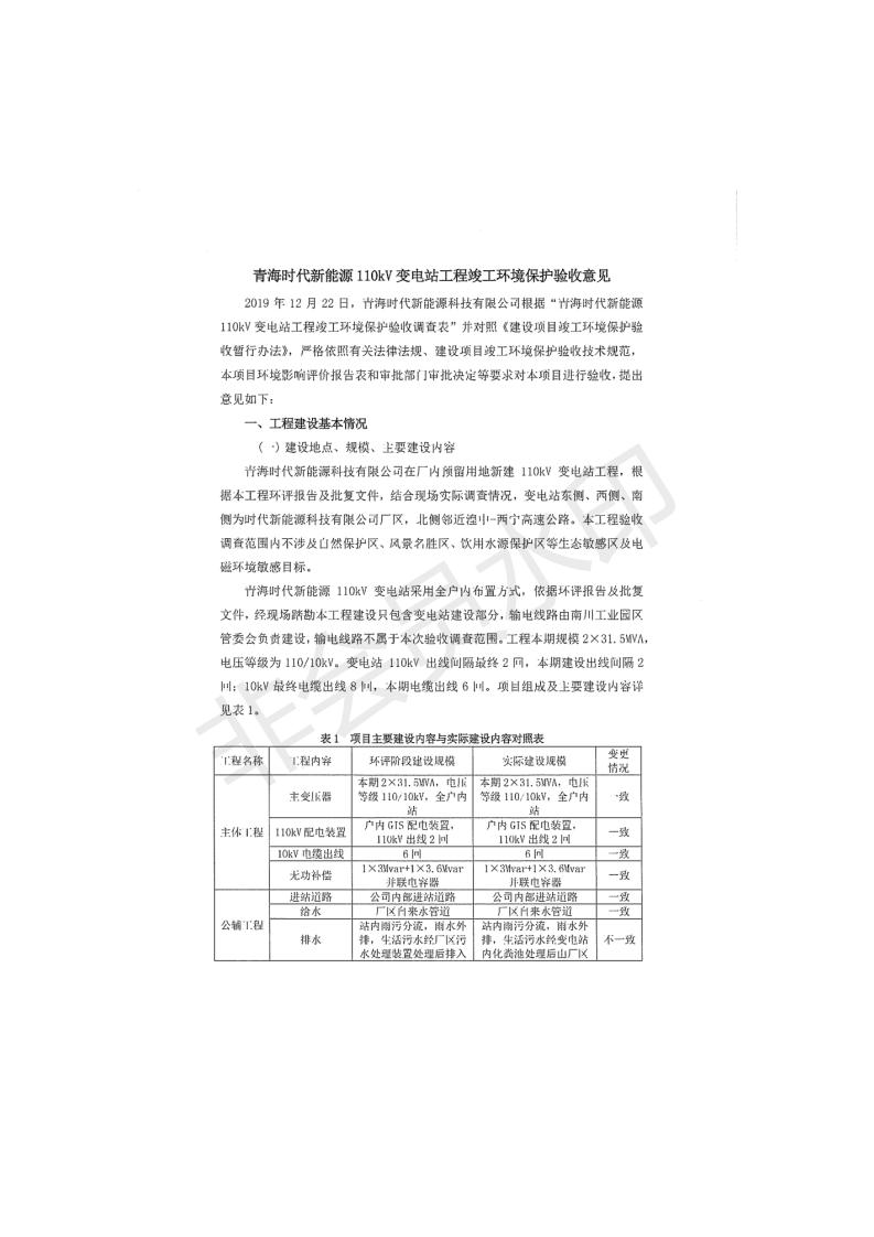 根據(jù)中華人民共和國(guó)國(guó)務(wù)院令第682號(hào)《國(guó)務(wù)院關(guān)于修改〈建設(shè)項(xiàng)目環(huán)境保護(hù)管理?xiàng)l例〉的決定》和《建設(shè)項(xiàng)目竣工環(huán)境保護(hù)驗(yàn)收暫行辦法》(國(guó)務(wù)院令682號(hào)),青海時(shí)代新能源110kV變電站工程(包括竣工環(huán)境保護(hù)驗(yàn)收調(diào)查表和驗(yàn)收意見)公示如下。 一、項(xiàng)目名稱:青海時(shí)代新能源110kV變電站工程 二、地點(diǎn):青海省西寧市南川工業(yè)園區(qū)創(chuàng)業(yè)路182號(hào)青海時(shí)代新能源科技有限公司廠區(qū)內(nèi) 三、建設(shè)單位:青海時(shí)代新能源科技有限公司 四、建設(shè)內(nèi)容:青海時(shí)代新能源 110kV 變電站采用全戶內(nèi)布置方式,依據(jù)環(huán)評(píng)報(bào)告及批復(fù)文件,經(jīng)現(xiàn)場(chǎng)踏勘本工程建設(shè)只包含變電站建設(shè)部分,輸電線路由南川工業(yè)園區(qū)管委會(huì)負(fù)責(zé)建設(shè),輸電線路不屬于本次驗(yàn)收調(diào)查范圍。工程本期規(guī)模2×31.5MVA,電壓等級(jí)為110/10kV。變電站 110kV 出線間隔最終2回,本期建設(shè)出線間隔2回;10kV最終電纜出線8回,本期電纜出線6回。 五、聯(lián)系人:張工 六、聯(lián)系電話:0971-6515411 七、公示時(shí)間:二〇二〇年一月十四日至二〇二〇年二月十三日 公示期間,對(duì)上述公示內(nèi)容如有異議,請(qǐng)以書面形式反饋,個(gè)人須署真實(shí)姓名,單位須加蓋公章。
