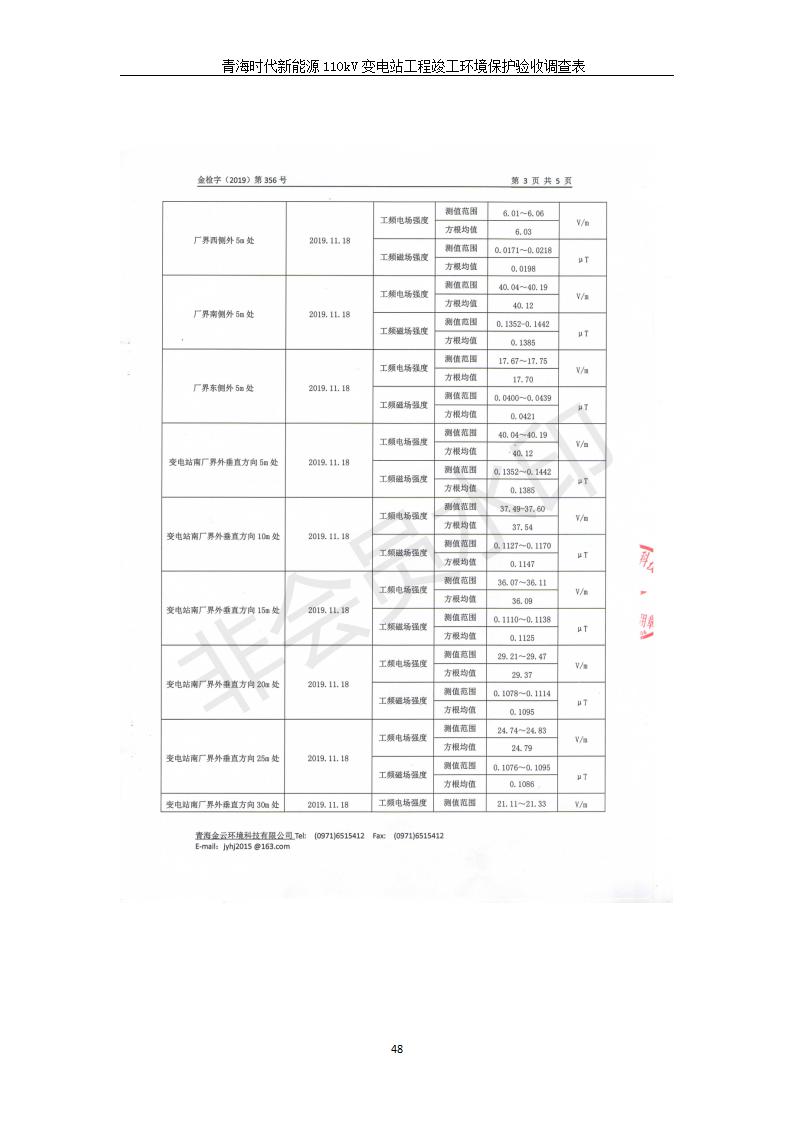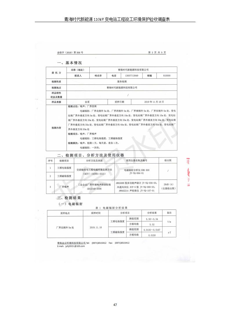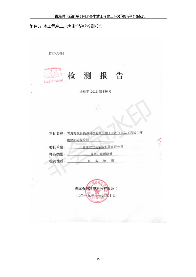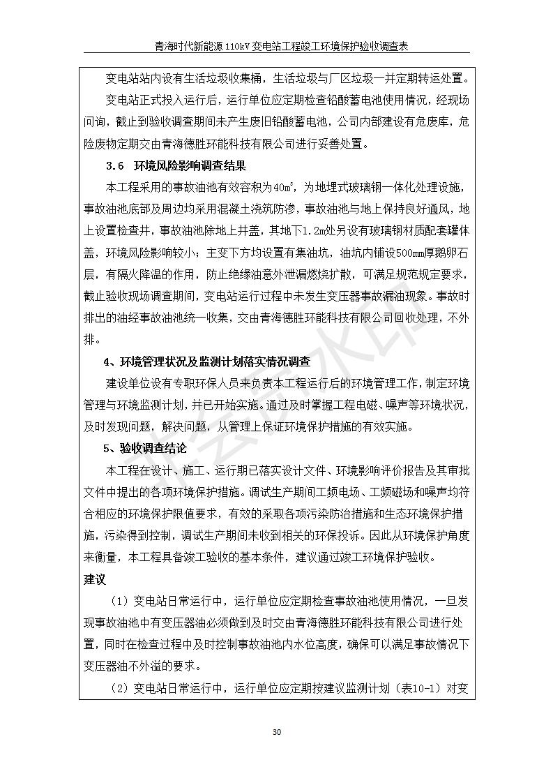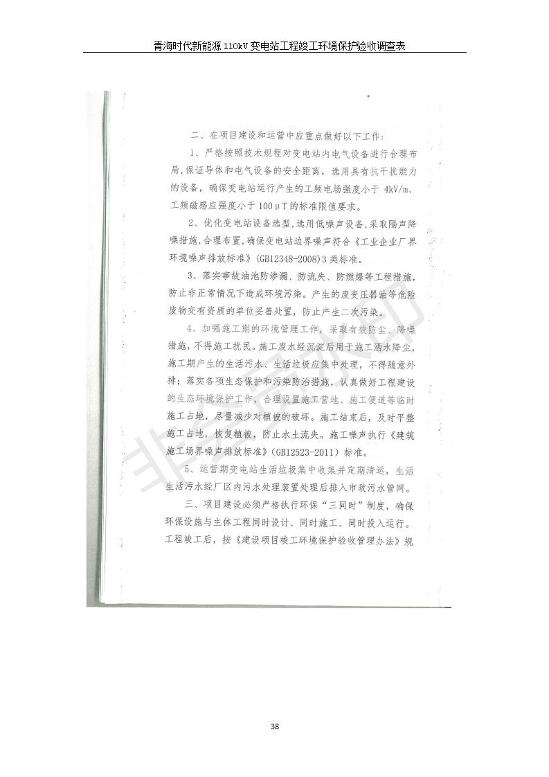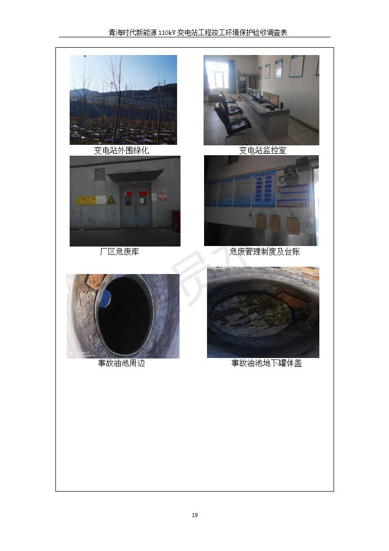 根據(jù)中華人民共和國(guó)國(guó)務(wù)院令第682號(hào)《國(guó)務(wù)院關(guān)于修改〈建設(shè)項(xiàng)目環(huán)境保護(hù)管理?xiàng)l例〉的決定》和《建設(shè)項(xiàng)目竣工環(huán)境保護(hù)驗(yàn)收暫行辦法》(國(guó)務(wù)院令682號(hào)),青海時(shí)代新能源110kV變電站工程(包括竣工環(huán)境保護(hù)驗(yàn)收調(diào)查表和驗(yàn)收意見)公示如下。 一、項(xiàng)目名稱:青海時(shí)代新能源110kV變電站工程 二、地點(diǎn):青海省西寧市南川工業(yè)園區(qū)創(chuàng)業(yè)路182號(hào)青海時(shí)代新能源科技有限公司廠區(qū)內(nèi) 三、建設(shè)單位:青海時(shí)代新能源科技有限公司 四、建設(shè)內(nèi)容:青海時(shí)代新能源 110kV 變電站采用全戶內(nèi)布置方式,依據(jù)環(huán)評(píng)報(bào)告及批復(fù)文件,經(jīng)現(xiàn)場(chǎng)踏勘本工程建設(shè)只包含變電站建設(shè)部分,輸電線路由南川工業(yè)園區(qū)管委會(huì)負(fù)責(zé)建設(shè),輸電線路不屬于本次驗(yàn)收調(diào)查范圍。工程本期規(guī)模2×31.5MVA,電壓等級(jí)為110/10kV。變電站 110kV 出線間隔最終2回,本期建設(shè)出線間隔2回;10kV最終電纜出線8回,本期電纜出線6回。 五、聯(lián)系人:張工 六、聯(lián)系電話:0971-6515411 七、公示時(shí)間:二〇二〇年一月十四日至二〇二〇年二月十三日 公示期間,對(duì)上述公示內(nèi)容如有異議,請(qǐng)以書面形式反饋,個(gè)人須署真實(shí)姓名,單位須加蓋公章。