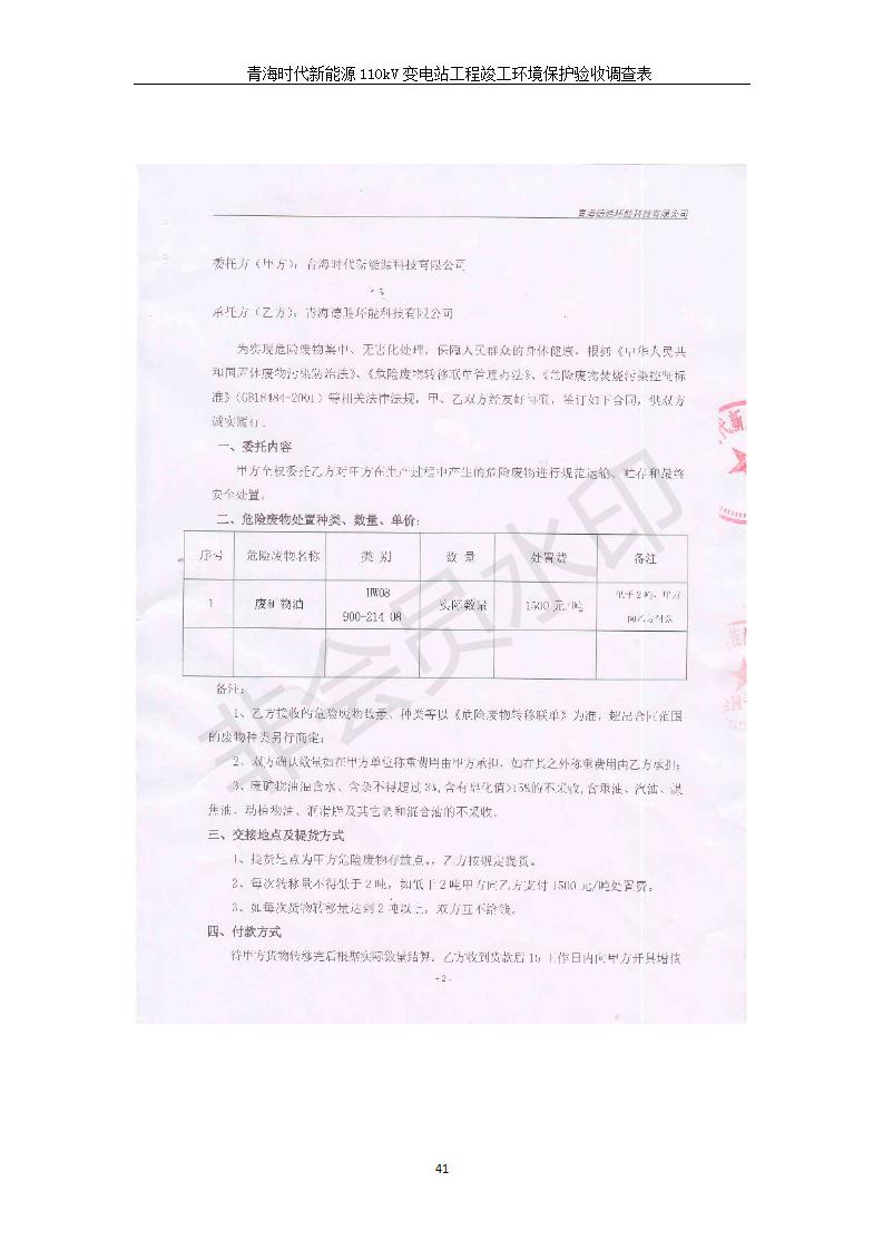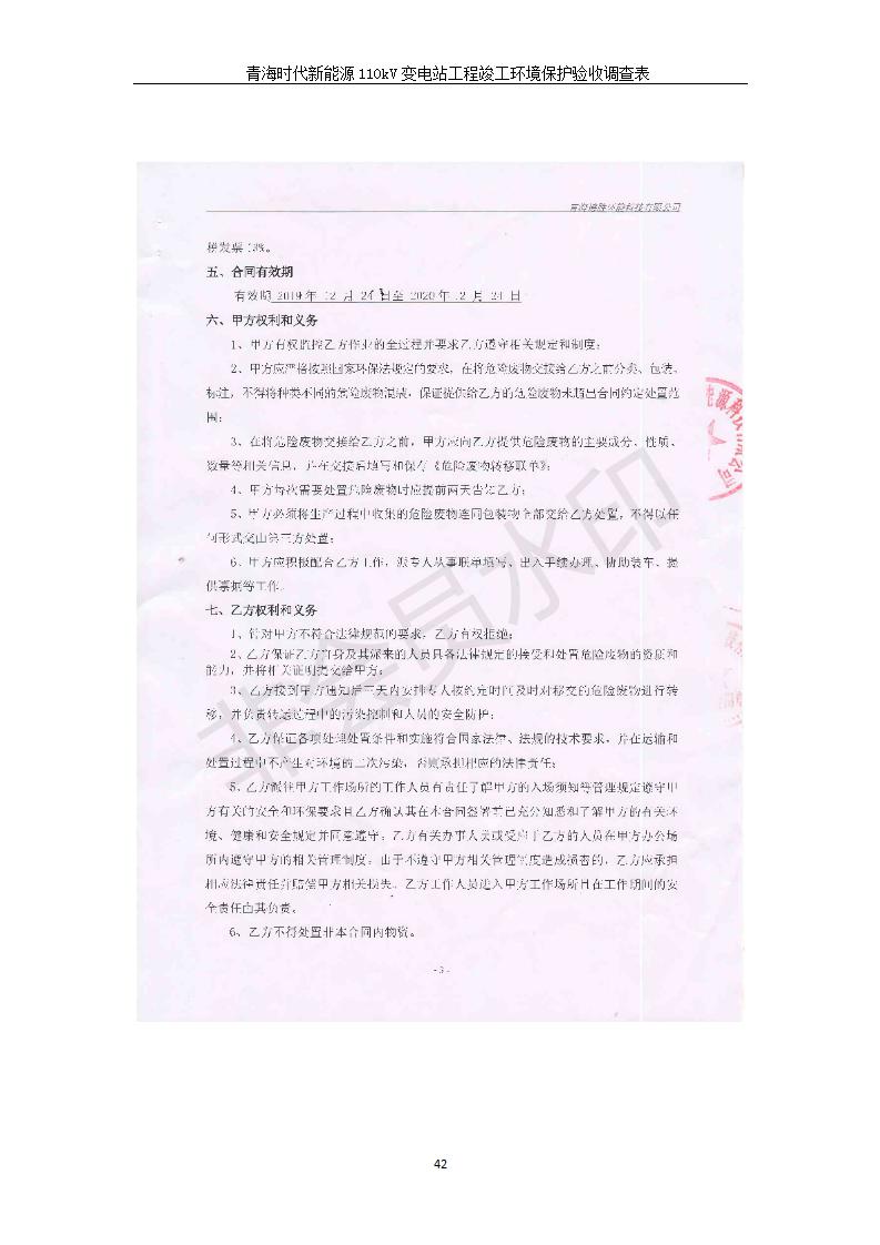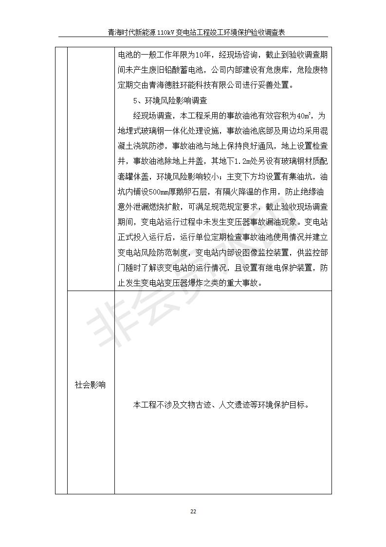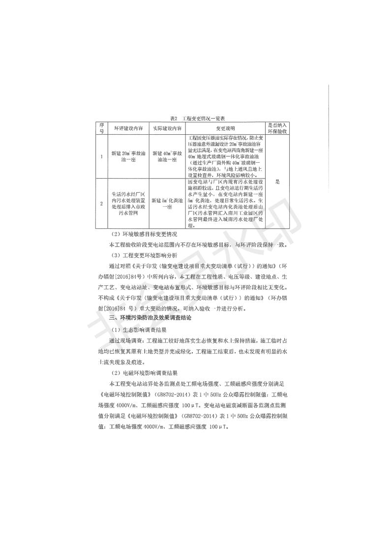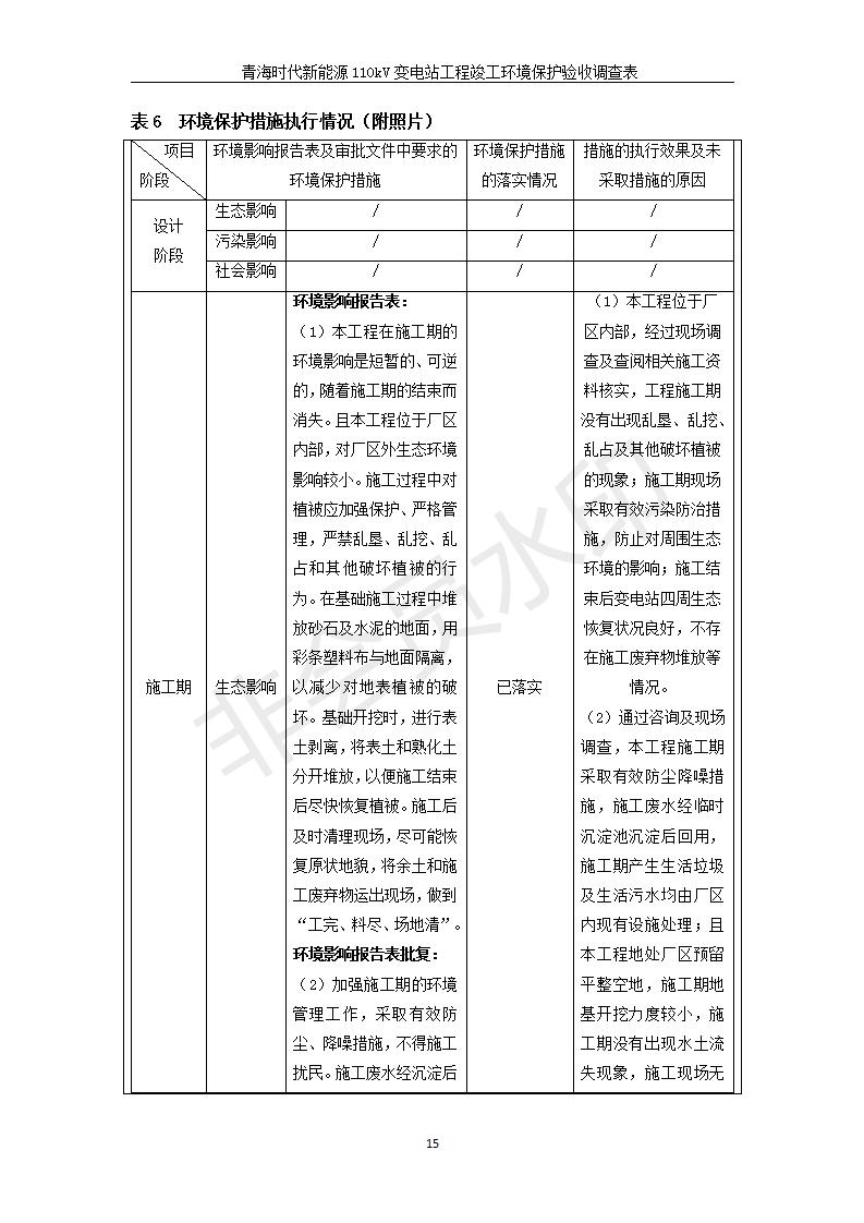 根據(jù)中華人民共和國(guó)國(guó)務(wù)院令第682號(hào)《國(guó)務(wù)院關(guān)于修改〈建設(shè)項(xiàng)目環(huán)境保護(hù)管理?xiàng)l例〉的決定》和《建設(shè)項(xiàng)目竣工環(huán)境保護(hù)驗(yàn)收暫行辦法》(國(guó)務(wù)院令682號(hào)),青海時(shí)代新能源110kV變電站工程(包括竣工環(huán)境保護(hù)驗(yàn)收調(diào)查表和驗(yàn)收意見)公示如下。 一、項(xiàng)目名稱:青海時(shí)代新能源110kV變電站工程 二、地點(diǎn):青海省西寧市南川工業(yè)園區(qū)創(chuàng)業(yè)路182號(hào)青海時(shí)代新能源科技有限公司廠區(qū)內(nèi) 三、建設(shè)單位:青海時(shí)代新能源科技有限公司 四、建設(shè)內(nèi)容:青海時(shí)代新能源 110kV 變電站采用全戶內(nèi)布置方式,依據(jù)環(huán)評(píng)報(bào)告及批復(fù)文件,經(jīng)現(xiàn)場(chǎng)踏勘本工程建設(shè)只包含變電站建設(shè)部分,輸電線路由南川工業(yè)園區(qū)管委會(huì)負(fù)責(zé)建設(shè),輸電線路不屬于本次驗(yàn)收調(diào)查范圍。工程本期規(guī)模2×31.5MVA,電壓等級(jí)為110/10kV。變電站 110kV 出線間隔最終2回,本期建設(shè)出線間隔2回;10kV最終電纜出線8回,本期電纜出線6回。 五、聯(lián)系人:張工 六、聯(lián)系電話:0971-6515411 七、公示時(shí)間:二〇二〇年一月十四日至二〇二〇年二月十三日 公示期間,對(duì)上述公示內(nèi)容如有異議,請(qǐng)以書面形式反饋,個(gè)人須署真實(shí)姓名,單位須加蓋公章。